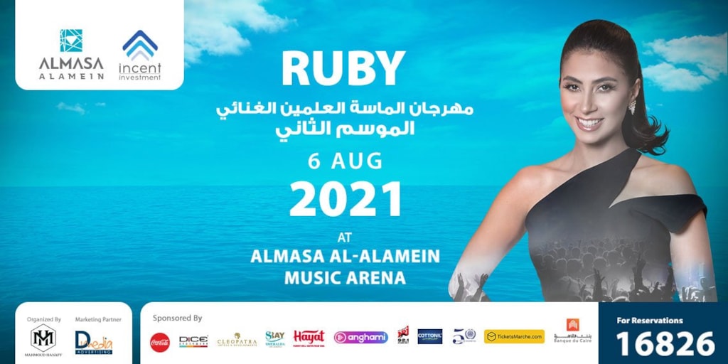 Ruby & Esseily. 06 Aug 2021 - 06 Aug 2021 8:00 Don't miss an outstanding concert by the great Ruby & the amazing Esseily at Al Masa New Alamein Date :06 Aug 2021 - 06 Aug 2021 Time : 8:00 Address : Alexandria - Marsa Matrouh Road, Markaz Al Alamein, Matrouh Governorate, North Coast Al Alameen Website : https://www.ticketsmarche.com/tickets/buy-tickets-ruby-esseily.html For Details