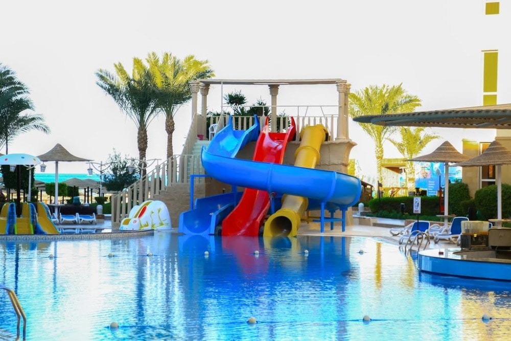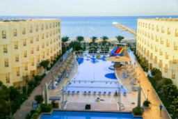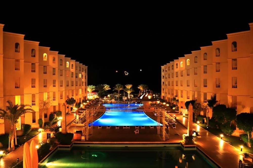 AMC Royal Hotel is a 5 stars resort that consists of 395 rooms in 2 wings (1-5 floors) and the main building. The resort is situated on the sandy beach of the Red Sea only 11 km north of Hurghada and 13 km south of El Gouna. The resort overlooks its own spacious private beach, offering a paradise for holidaymakers: sun, sand, and sea. The resort is an all-inclusive property offering full board accommodation except for lobster and shrimp items. All local drinks (soft and alcoholic) are also included as well as non-motorized sports.