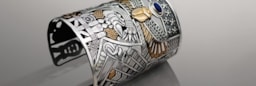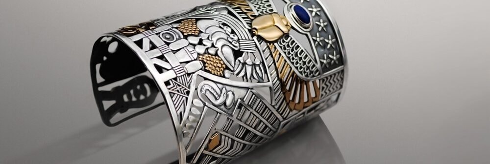 The silver and gold collections are inset with precious and semi-precious gemstones in traditional motifs found in Pharaonic, Islamic, Turkish, Egyptian rural and Bedouin cultures. See translation