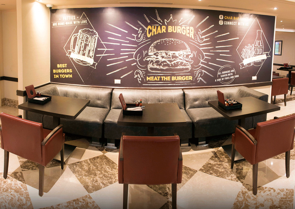 Char Bar is a trendy, laid-back bar, wherein you can enjoy a domestic dinner with family and friends. The bar proffers a wide range of favorites cooked just as you like – from internationally inspired grilled burgers to cold beer and shakes while you are watching you best match on a flat-screen TV. Char Bar’s exotic burger "Char" comprises a home-made beef patty, fried eggs, potato chips, mushroom and cheese sauce; Chilly Billy, a freshly homemade patty with chili beef stew, avocados and salsa cruda. Moreover, the restaurant extends an array of salads, appetisers and hot dogs. Picks encompass a beef taco salad; a marinated flank steak with jalapeno, tortilla chips, red beans and cheese; the chili hotdog with chili beef stew, salsa cruda and cheese sauce.