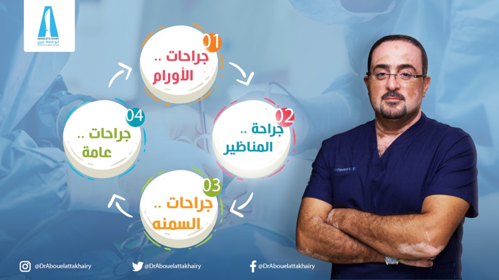 Abouelatta Khairy is a consultant in general surgery, surgical oncology, obesity, and laparoscopic surgery. He has a master's degree in general surgery at Ain Shams University. General surgery is a surgical field that deals with abdominal contents including esophagus, stomach, small intestine, large intestine, liver, pancreas, gallbladder, appendix and bile ducts, and often the thyroid gland. It is also concerned with diseases involving the skin, breast, soft tissue, trauma, Peripheral artery disease, and hernias. General surgeons are also trained to conduct gastroscopy and colonoscopy surgeries. General surgeons may sub-specialize into one or more of the following specialties: Laparoscopic surgery, Trauma surgery, Colorectal surgery, Breast surgery, Vascular surgery, Endocrine surgery, Transplant surgery, Surgical oncology, Cardiothoracic surgery, and Pediatric surgery See translation