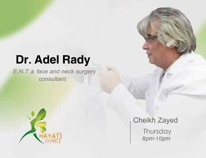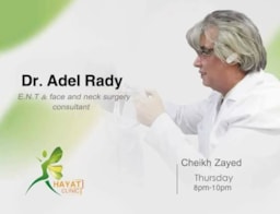 Adel Rady is a physician with a master's degree in Otorhinolaryngology. He is a fellow of the European Board of Otorhinolaryngology. Otorhinolaryngology is a medical specialty that is concerned with the surgical and medical supervision of head and neck conditions, namely in the ear, nose, and throat regions. Otorhinolaryngologists deal with a wide range of procedures, such as tonsillectomy (removal of tonsils), adenoidectomy (removal of adenoids), septoplasty (correction of nasal septum to prevent obstruction and enable clear breathing), and tracheostomy (a surgical procedure in which an incision is made into the trachea, through the neck, and a tube inserted so as to make an artificial opening in order to assist breathing), among other procedures. See translation