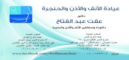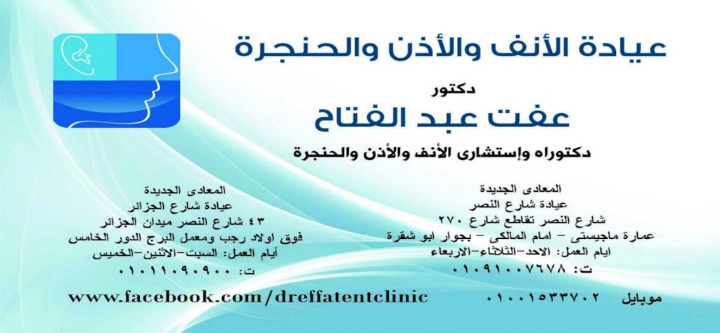 عفت عبد الفتاح: استشاري جراحة الأذن والأنف والحنجرة. طب الأنف والأذن والحنجرة هو تخصص طبي يُعنى بالإشراف الجراحي والطبي على أمراض الرأس والرقبة، وتحديداً في مناطق الأذن والأنف والحنجرة. يتعامل اختصاصيو الأنف والأذن والحنجرة مع مجموعة واسعة من الإجراءات، مثل استئصال اللوزتين، واستئصال اللحمية، ورأب الحاجز الأنفي (تصحيح الحاجز الأنفي لمنع الانسداد وتمكين التنفس الصافي)، وفغر القصبة الهوائية (إجراء جراحي يتم فيه إحداث شق في القصبة الهوائية، من خلال الرقبة، ويتم إدخال أنبوب لإحداث فتحة صناعية للمساعدة على التنفس)، من بين إجراءات أخرى