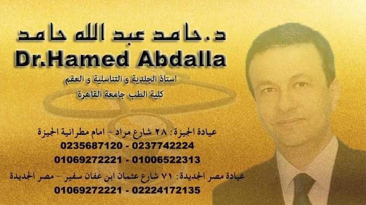 حامد عبد الله: أستاذ الأمراض الجلدية والتناسلية بكلية الطب جامعة القاهرة. طبيب الأمراض الجلدية هو طبيب متمرس في علاج الحالات التي تشمل بشكل أساسي اضطرابات الجلد والشعر والأظافر والأغشية المخاطية. ويتخصص أطباء الجلد في علاج الإكزيما، والصدفية، وسرطان الجلد، من بين حالات أخرى. ويعد الجلد التخصص الرئيسي لأطباء الأمراض الجلدية، وهو الجزء الأكبر من الجسم والعضو الدفاعي الرئيسي ضد مسببات الأمراض والإصابات. ويعمل أطباء الأمراض الجلدية عادة على تطعيم البوتوكس أو الفيلر مثل الكولاجين والدهون داخل الجلد كوسيلة لتنشيطه. كما يستخدم أطباء الجلد جراحة الليزر للقضاء على مجموعة واسعة من أوجه القصور الجلدية، مثل الأورام، والثآليل، والشامات، والأوشام غير المرغوب فيها، والوحمات، والندوب، والتجاعيد.