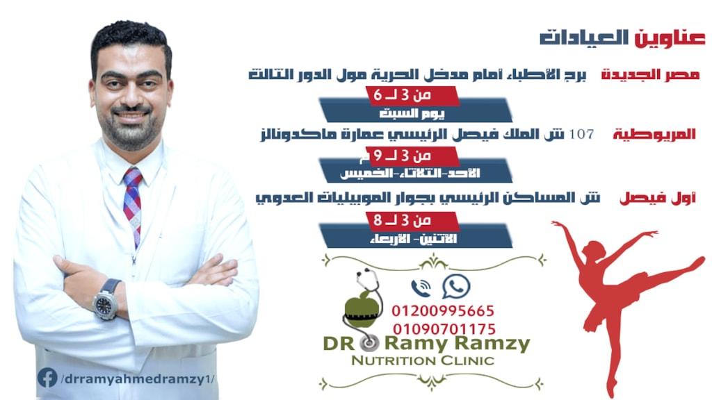 Ramy Ahmed is a consultant in diet and nutrition with a master's degree in Physiotherapy at Cairo University. Nutritionists are physicians who obtain a bachelor's degree in dietetics, foods, nutrition, and food service management or food science. A nutritionist gives advice, helps treating chronic diseases, and deals with food allergies, sensitivities, weight gain, and self-image. Medical nutrition therapy has proven effective for a plethora of people in terms of weight loss; Nutritionists work to specify for each patient the number of sufficient calories he/she needs to have per day after weighing and measuring the patient for height. See translation