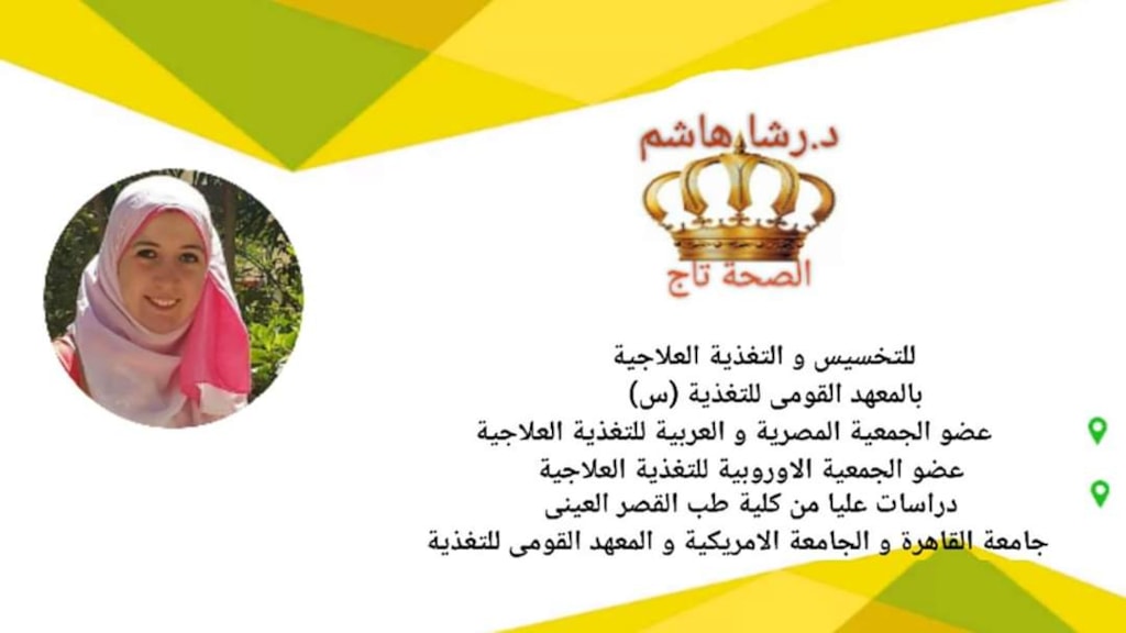Rasha Hashem is a nutritionist who obtained a postgraduate degree from The Faculty of Medicine at Cairo University, AUC, and the National Nutrition Institute (NNI). She is a specialist in conducting diet plans for obesity management for children, athletes, diabetics, liver patients, and cancer patients. Nutritionists are physicians who obtain a bachelor's degree in dietetics, foods, nutrition, and food service management or food science. A nutritionist gives advice, helps treating chronic diseases, and deals with food allergies, sensitivities, weight gain, and self-image. Medical nutrition therapy has proven effective for a plethora of people in terms of weight loss; Nutritionists work to specify for each patient the number of sufficient calories he/she needs to have per day after weighing and measuring the patient for height. See translation