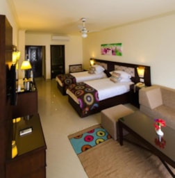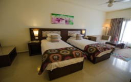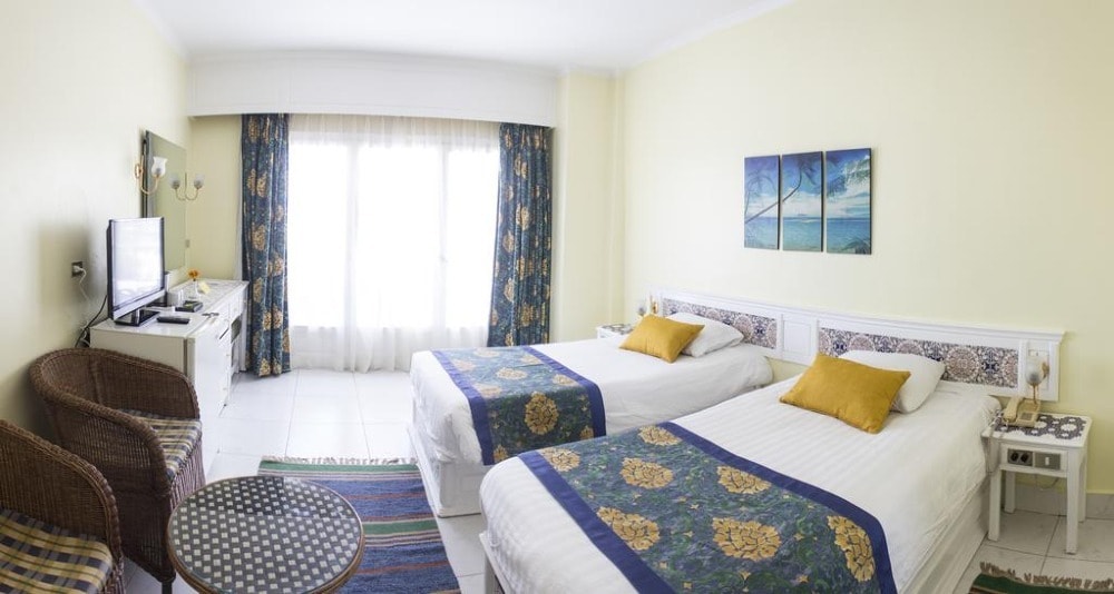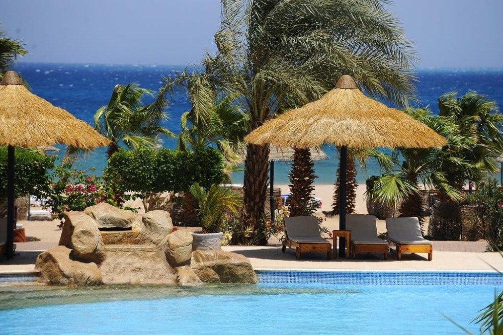 Nestled in Abu Souma Bay, on the west coast of the Red Sea, this idyllic resort is blessed with year-round sunny weather. The resort lies along a pristine sandy beach with a private marina and is built upon magnificent 42000 sqm surrounded by gardens. Only a short distance from Hurghada center, the resort allows guests to enjoy a peaceful and relaxing atmosphere. This resort offers a large selection of suites and rooms. Guests can enjoy a multitude of dining facilities, daily entertainment, health club, theater, water sports, snorkeling, and a private diving center.