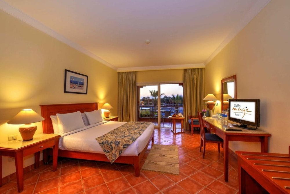 Magic Tulip Resort offers a perfect place to explore and enjoy the Red Sea with its Amazing Coral Reefs & Pure Water. The resort comes with 4-star rooms, every room has Fully adjustable air-condition, Safe deposit box, mini bar, wardrobe, shower, Hairdryer, LCD TV 32", International satellite, Fire Alarm System & Smoke Detectors, Terrace or balcony with Pool view or Sea view & Garden view. The Jasmine Restaurant serves buffet-style meals, while the Baccara Restaurant offers Italian dishes and pizzas. There is also a fish restaurant, a pool bar and an English pub with a disco at Magic Tulip Resort. Guests can explore the Red Sea’s coral reefs during a snorkeling trip or play a game of tennis. It is also possible to work out in the gym or to make a camel ride on the beach. The hotel also provides a spa, fitness centre, and a private beach area.