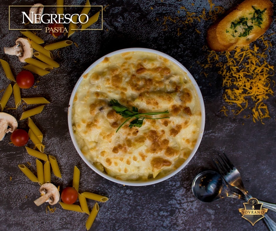 Sovrano is a fancy Italian cafe and restaurant with a garden view and an indoor area. There is also an area available for Kids. The recommended dishes include Chicken Mushroom Soup, Greek Salad, Chicken Pesto, Negresco, Spaghetti with Shrimp, Pizza Margherita, and more. In Sovrano, you will catch winds of the authentic Italian identity and cuisine. See translation