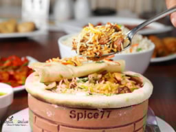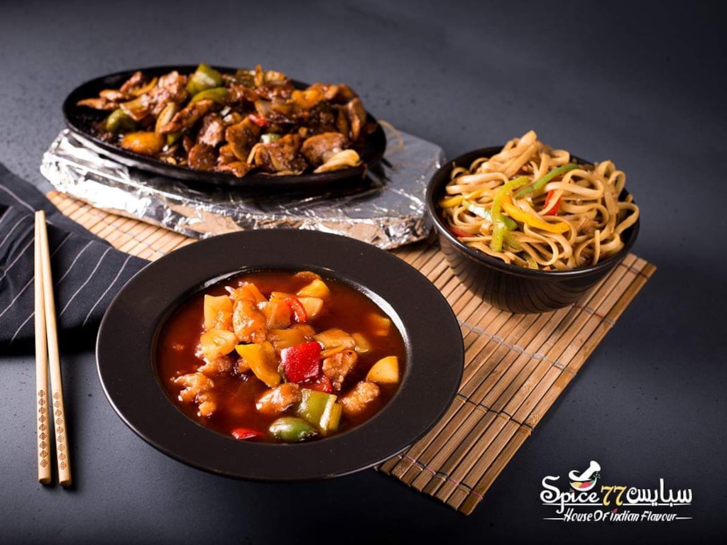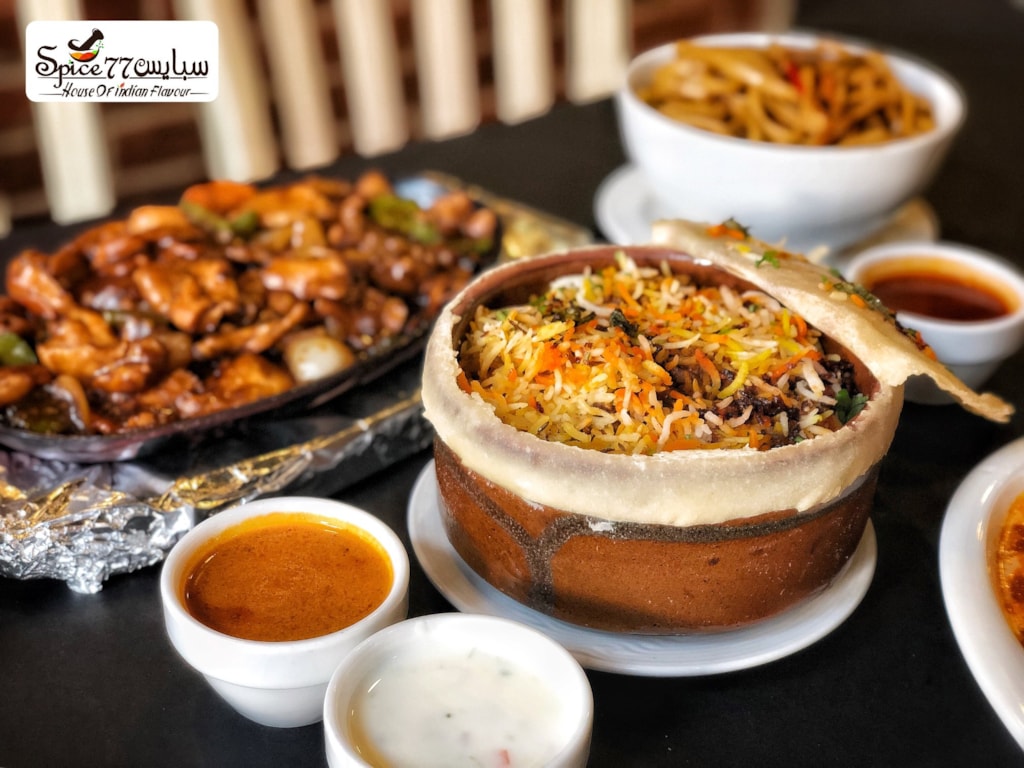 كما يتجلى من اسمه، يقدم سبايس مجموعة متنوعة من المأكولات الهندية والصينية لإضفاء الحيوية على حياتك. هناك الكثير من الخيارات من الدرجة الأولى حيث تغطي القائمة العديد من الأطباق الهندية الصينية، وأطباق الكاري، وسندويشات الإفطار، والخبز، والحلويات، والأرز والبرياني، والأرز المقلي، وأطباق التندوري، والمشروبات. يمكننا أن نقول أن سبايس77 هو المطعم الأسيوي الذي يريده الجميع بوجباته اللذيذة وأسعاره المعقولة
